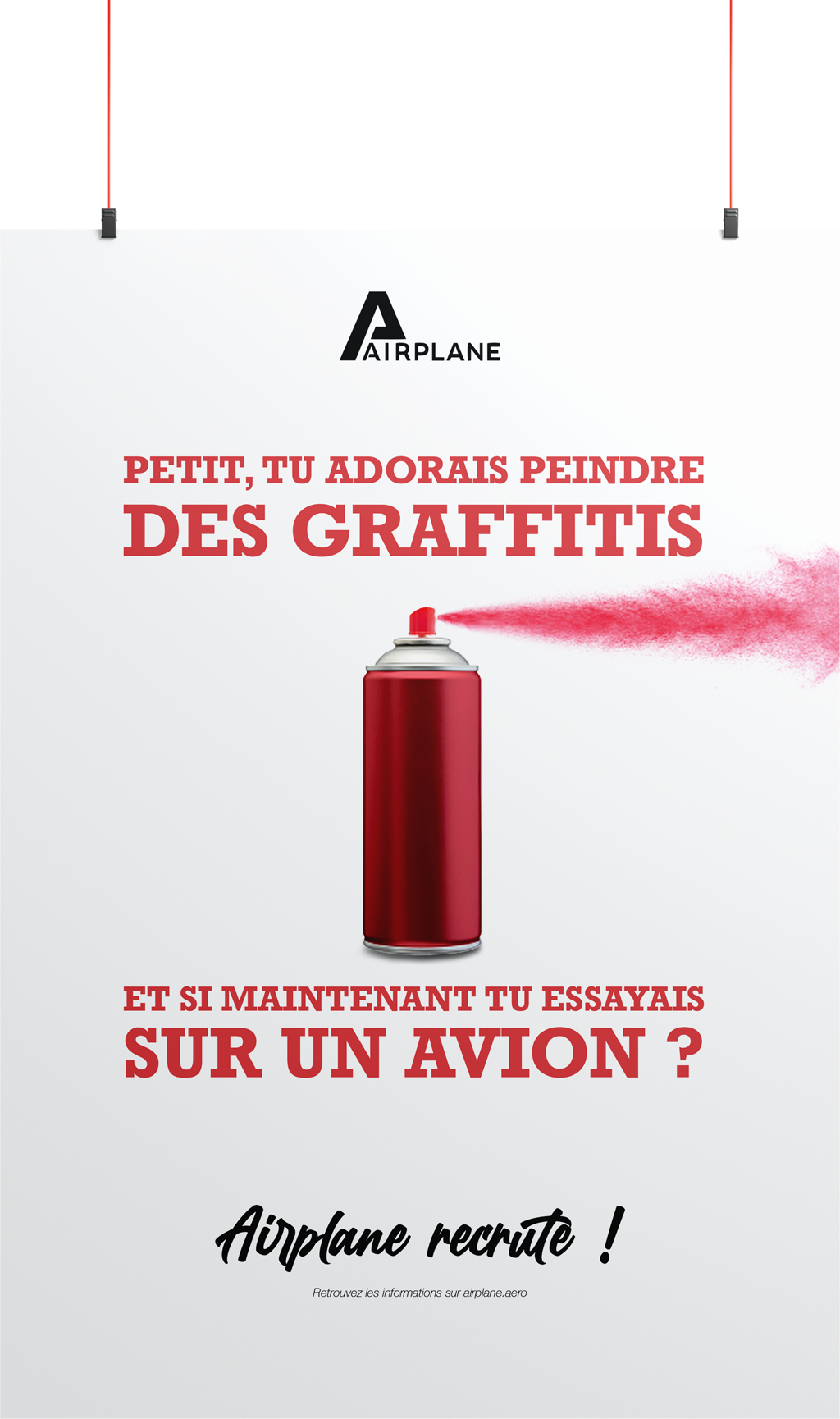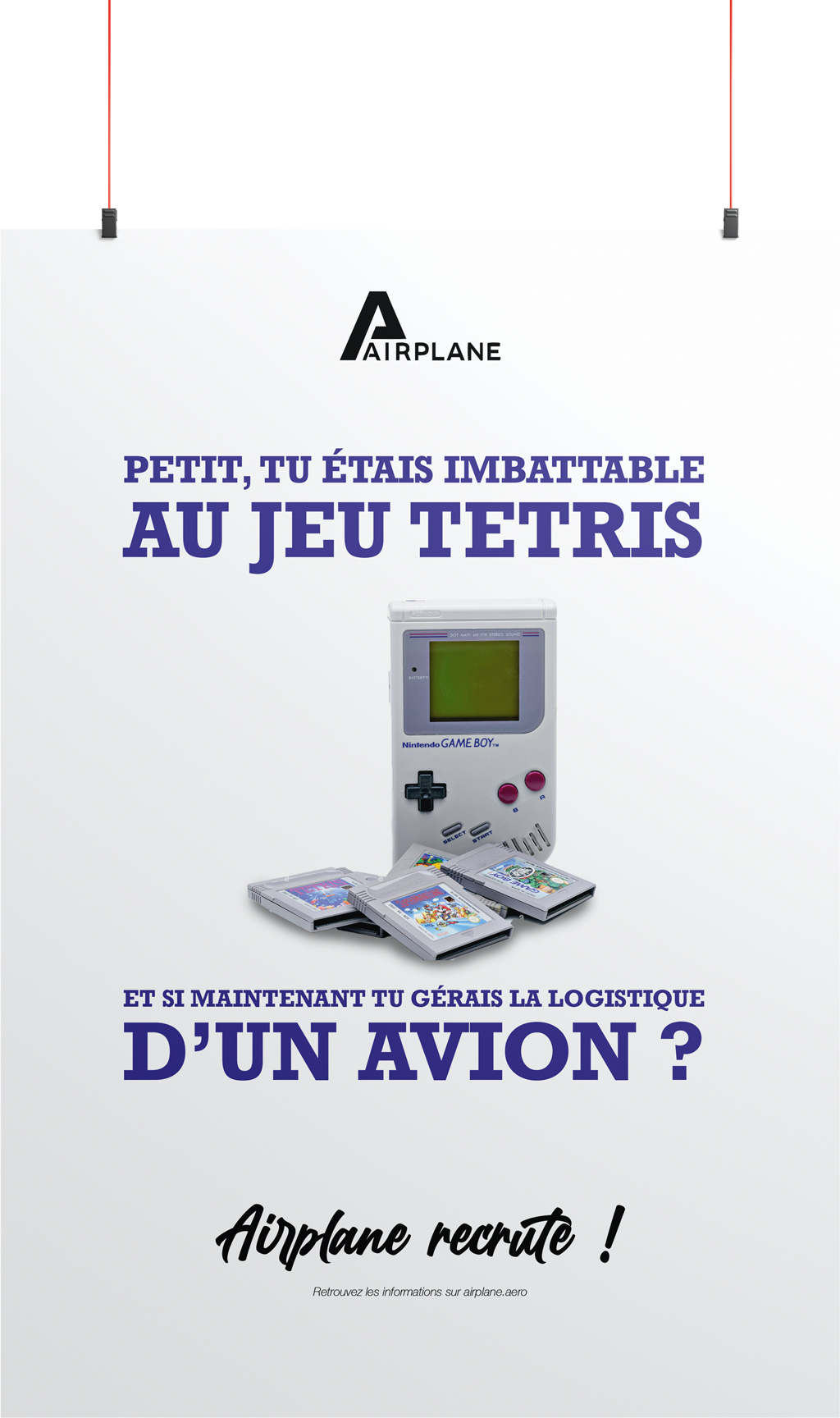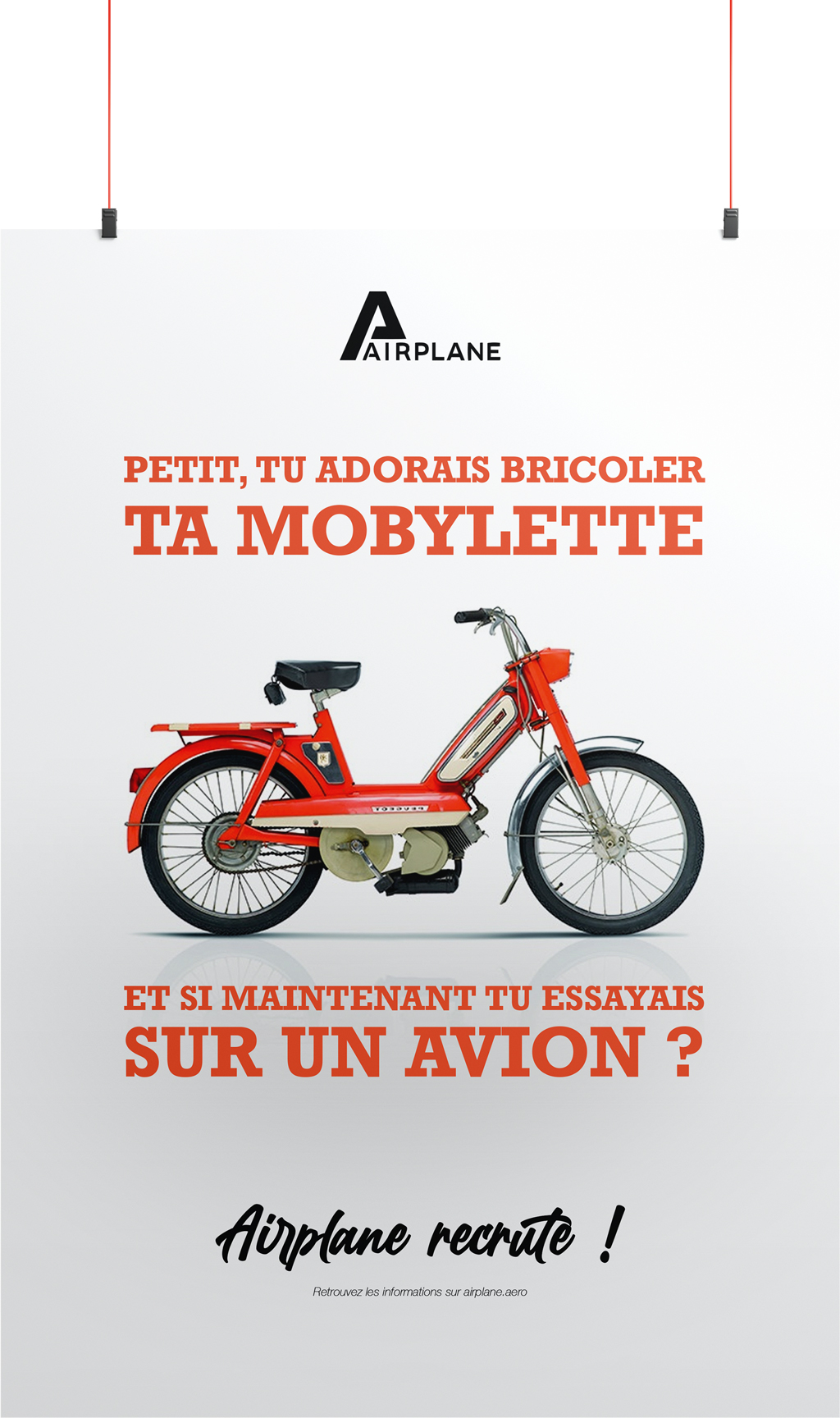 Nous avons opté pour une composition centrale afin d’obtenir un bon compromis entre impact visuel et hiérarchie des informations. Le regard se pose en premier sur les photos de ces objets populaires avant de parcourir les textes pour comprendre de quoi on parle, pour finir par le message le plus important : Airplane recrute !