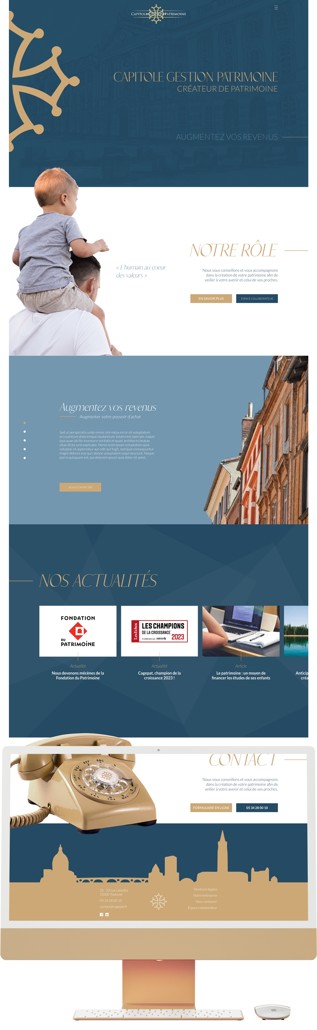 L'analyse du site précédent de l'agence a souligné une arborescence trop complexe ainsi qu'un manque global d'espace entre les éléments. Nous avons donc simplifié le plan du site et fait la part belle aux images en veillant à conserver de l'air entre les sections pour assurer une navigation fluide et agréable.